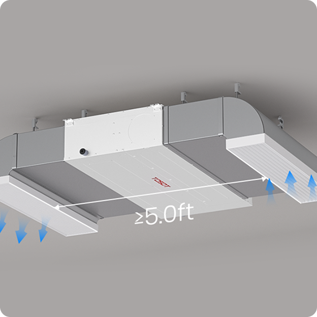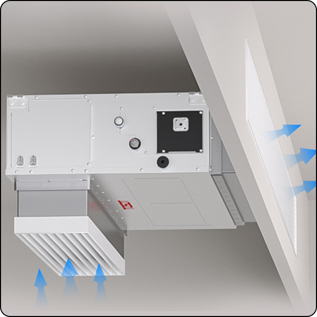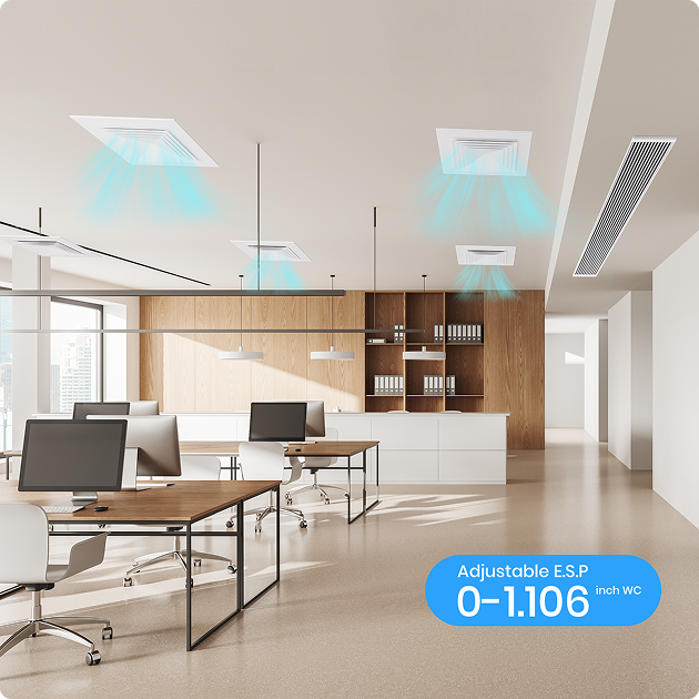 Designed for larger spaces and extended duct runs, this unit delivers adjustable external static pressure up to 1.106 in. WC (275 Pa). Ideal for high-ceiling areas and ductwork with multiple branches or bends—perfect for large residences and light commercial environments.