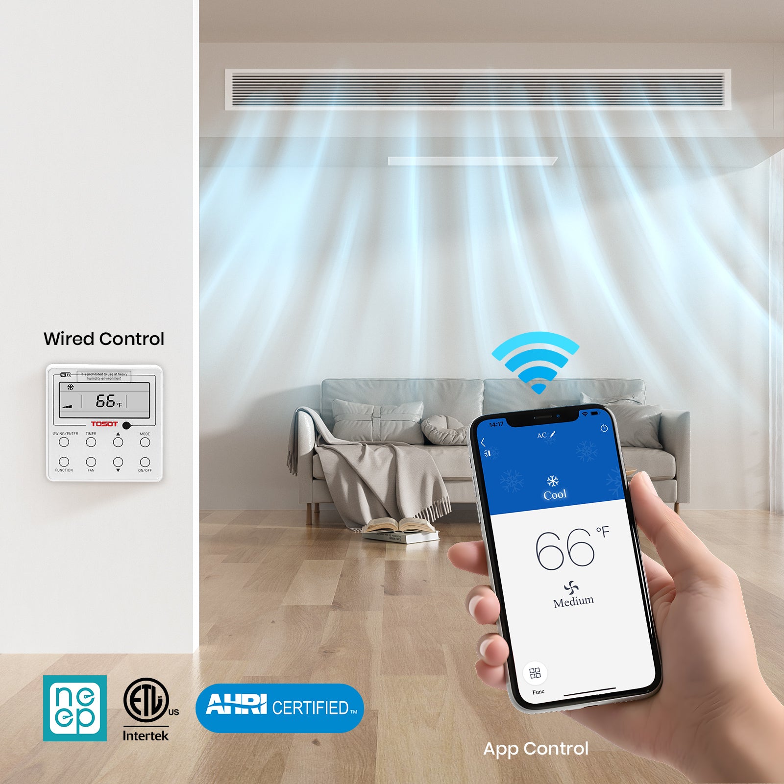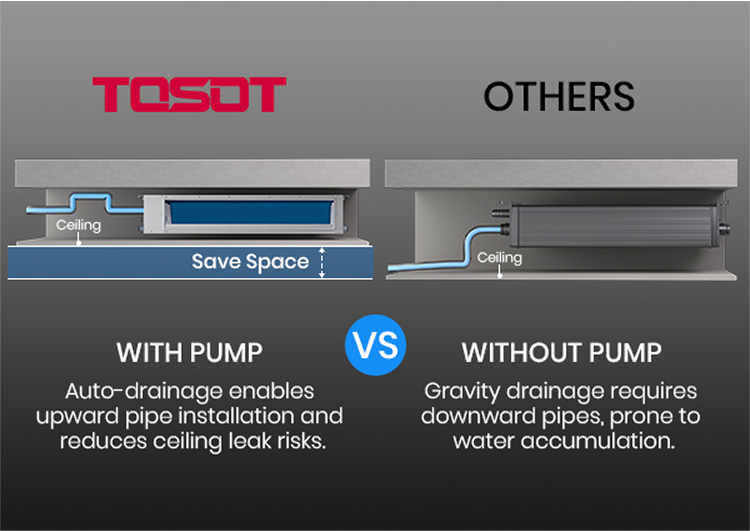 The built-in float switch monitors water condensation levels in real time. When water reaches a critical height, it triggers an alarm on the wired controller. It works with the drainage pump to ensure proper water discharge and prevent potential ceiling damage.