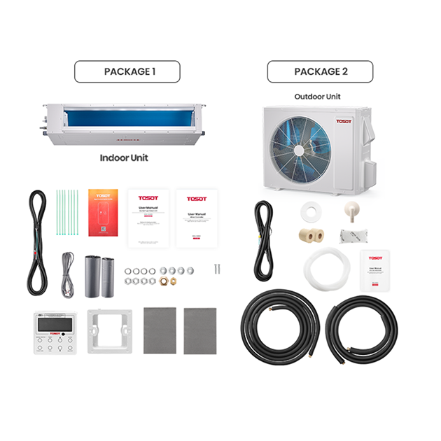 The TOSOT Cosmo ducted mini-split AC system comes with an accessory kit, as shown in the image, to assist with installation. The ducts and grille are not included. If you have any questions about the included parts, feel free to contact us.
